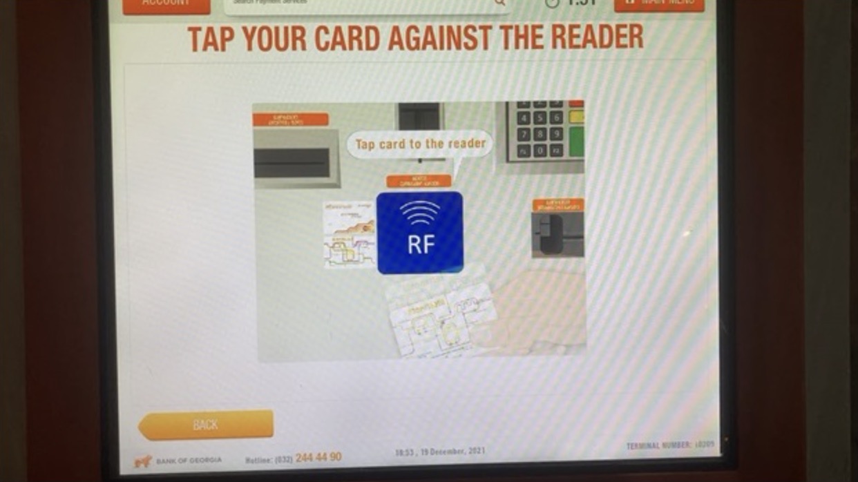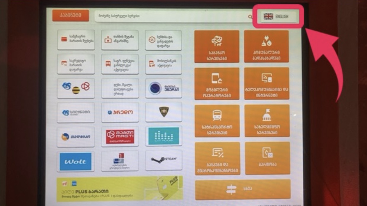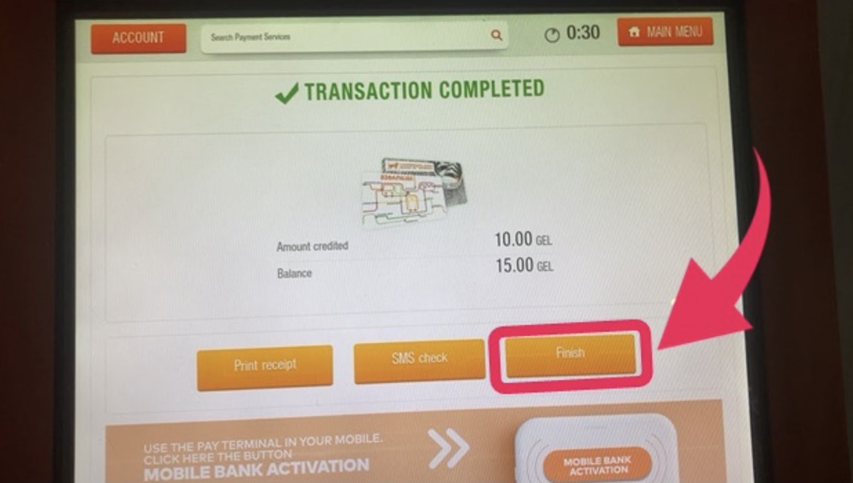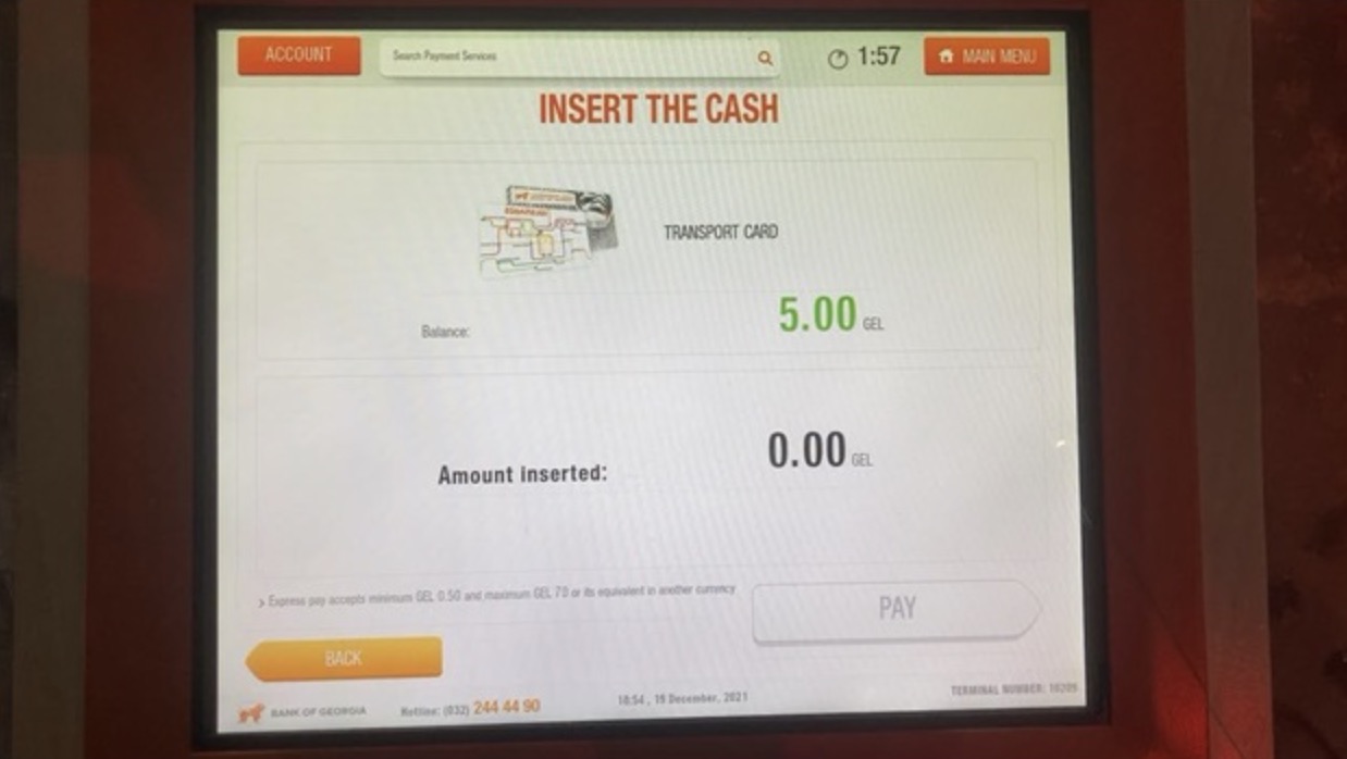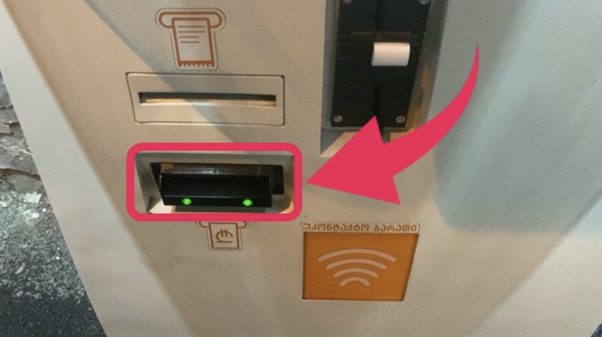 If you want to pay with a 1 GEL coin, insert the coin into the coin slot located below the touch panel and take the receipt.