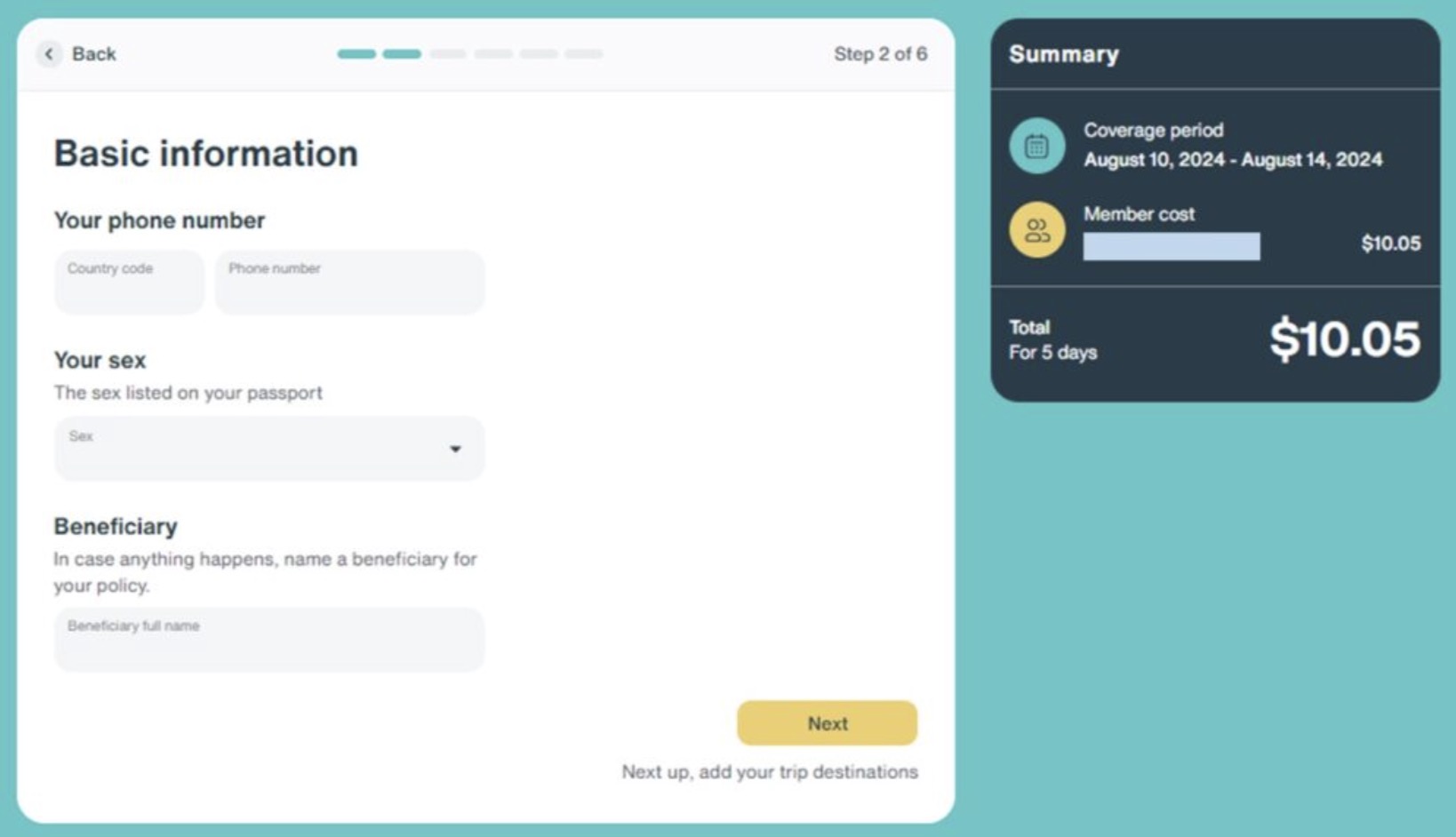 On the following page, enter your phone number, gender, and the name of your beneficiary—the person who would receive the insurance benefits in the unlikely event of a serious accident or death.