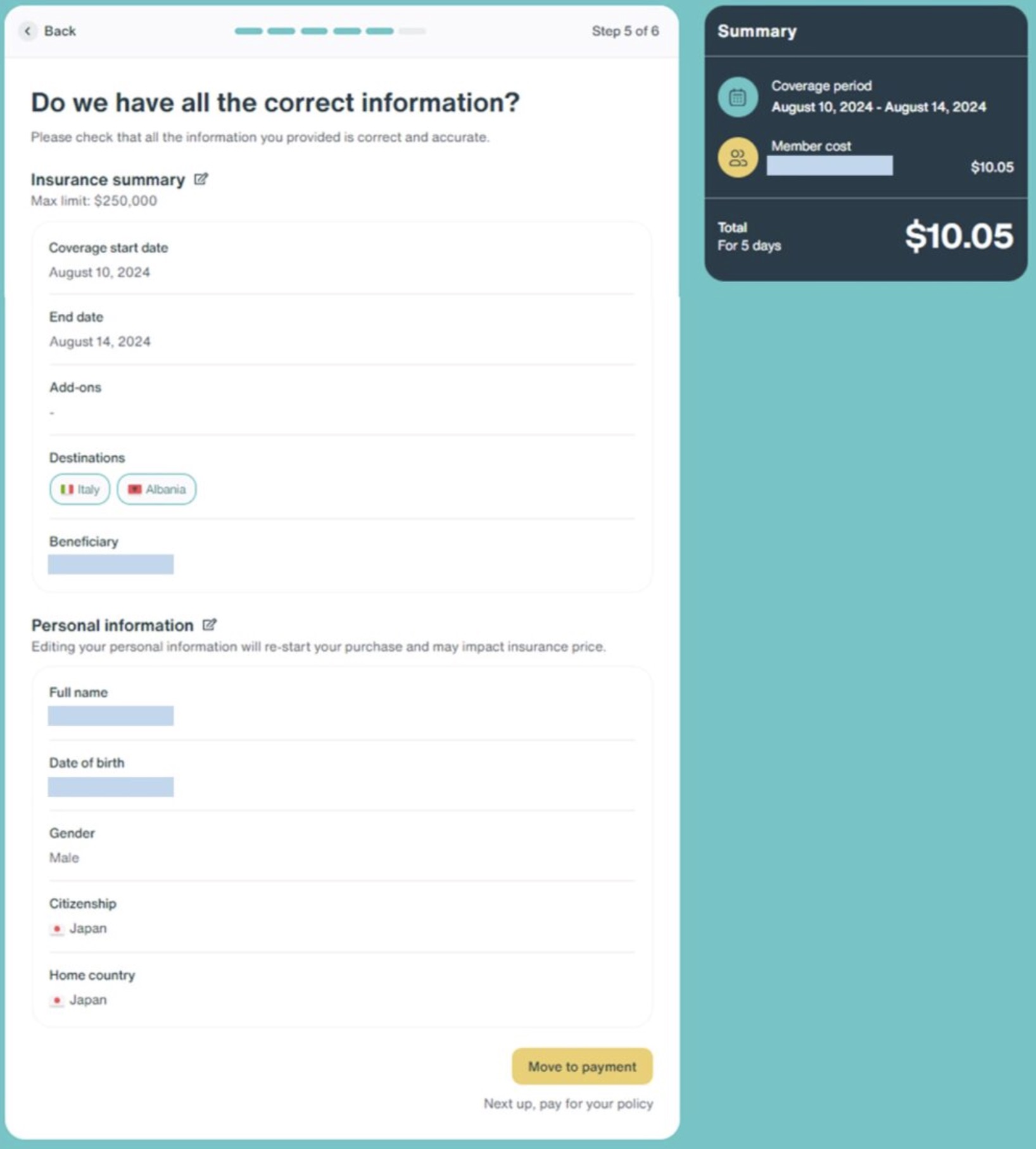 As shown in the screenshot above, the insurance fee for your selected coverage period will appear on the right side of the screen.