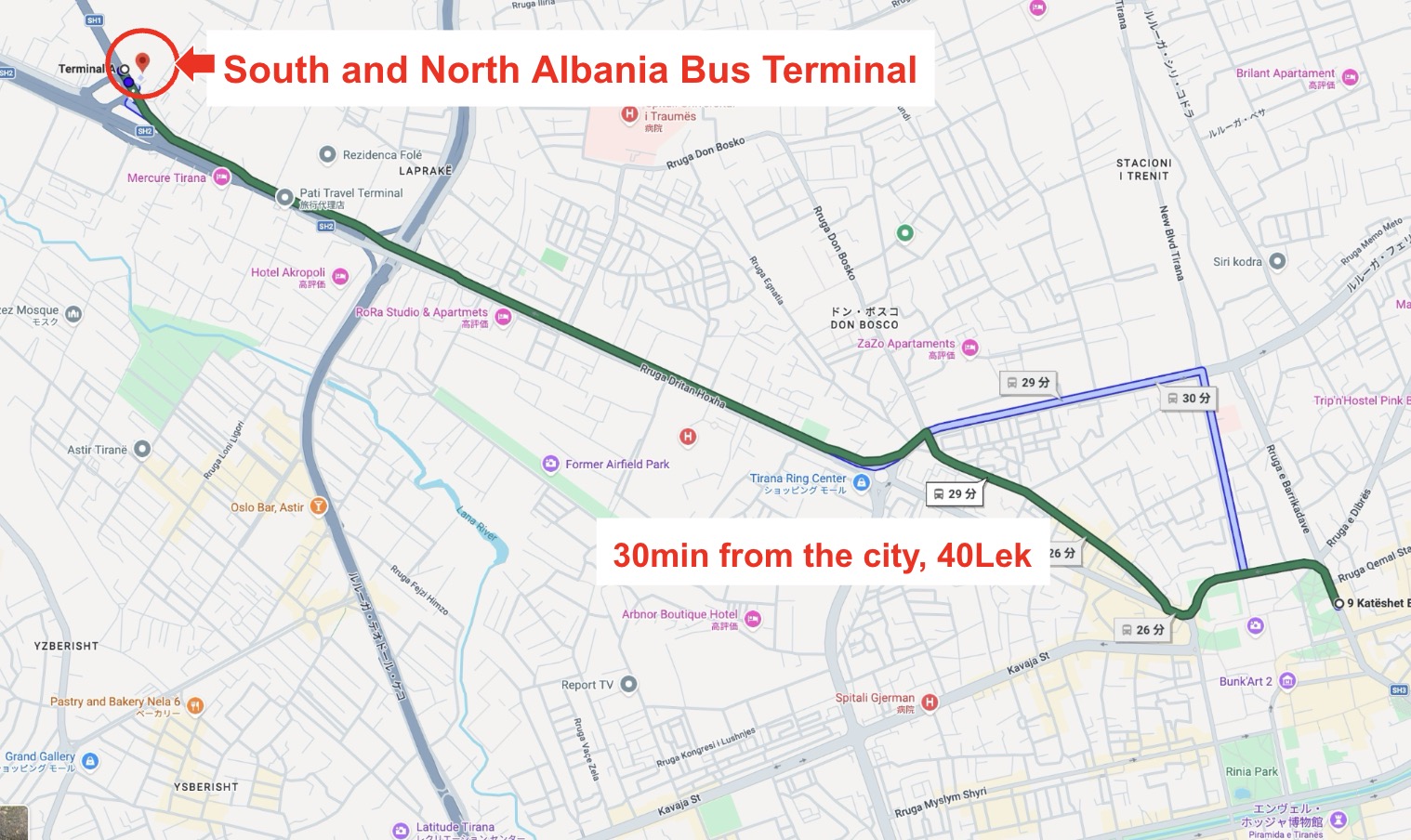 As of 2026, bus routes inside Tirana are shown on Google Maps. You can take bus No. 4 or No. 5B to reach the bus terminal.